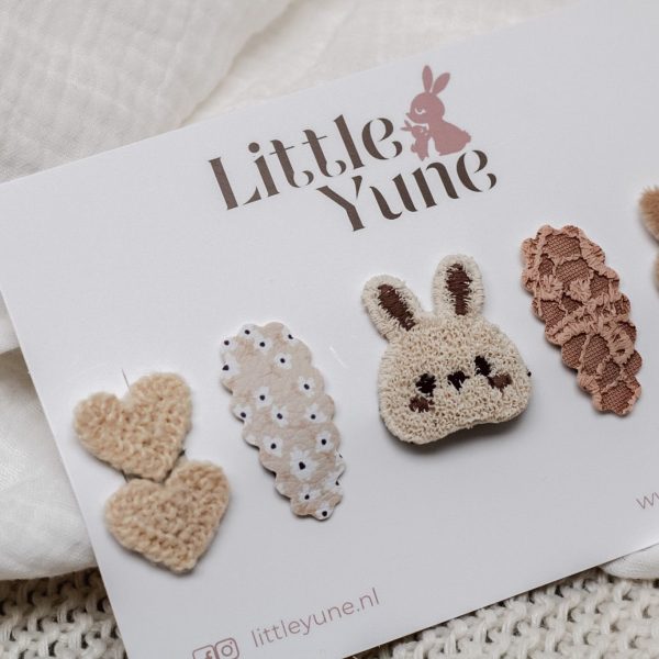Knuffelzacht, schattig en zó handig! De Bunny Cuddle Mix is een set van vijf antislip speldjes in warme neutrale tinten. Je krijgt een fluffy bunny, een lief gebreid hartjes-duo, een speels stipjesclipje, een romantisch “kant” lookje én een zachte bunny-silhouet. Alle speldjes hebben een antisliplaagje aan de binnenkant, waardoor ze ook in fijne haartjes blijven zitten zonder te trekken.