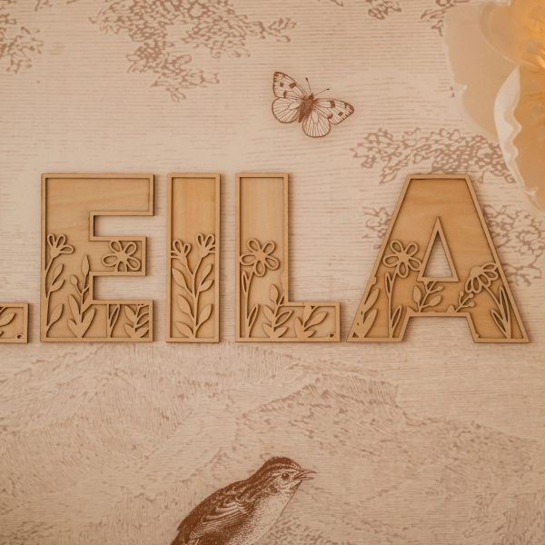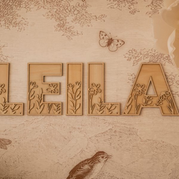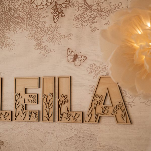 Ze zijn gemaakt van 6 mm lindehout en met zorg uitgesneden in een zacht bloemen- en bladpatroon. Dat geeft de letters een rustige, dromerige uitstraling die niet overheerst, maar juist mooi meebeweegt met de rest van de kamer.