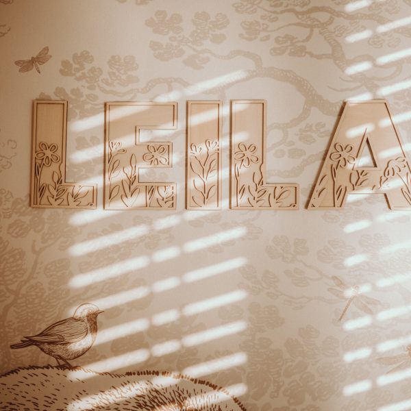 Elke letter is gemaakt van 6 mm lindehout en zorgvuldig uitgesneden met een bloem- en bladpatroon. Dat opengewerkte detail geeft de letters een zachte en dromerige uitstraling, zonder dat het te druk wordt. De naturel houtkleur zorgt ervoor dat de letters in elke kamer passen, van babykamer tot tienerkamer.