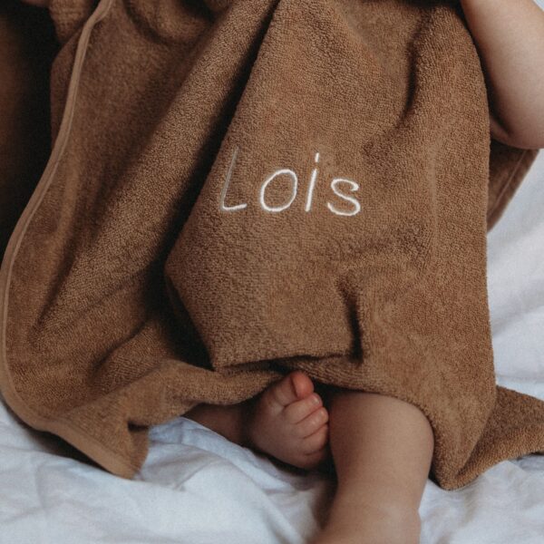 Wat deze badponcho extra bijzonder maakt, is dat je ‘m kunt laten personaliseren. Ik borduur met liefde een naam of initiaal op de poncho, precies zoals jij het invult. Je kiest zelf het lettertype en de kleur van het garen, zodat hij helemaal past bij jouw stijl (of die van je mini).