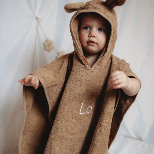 Je kunt de poncho personaliseren met een naam of initiaal in een lettertype en kleur die jij kiest. Verkrijgbaar in Biscuit, Wild Rose en Nougat. Ook perfect als kraamcadeau 💛