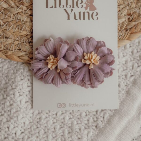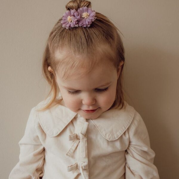 Bloem Juna is een prachtige lila alligatorspeld met twee zachte bloemen en een crème hartje 💜🌸 De bloemen geven iedere hairdo meteen een lieve en romantische uitstraling. Perfect voor een staartje, half-up hairdo of een plukje uit het gezicht ✨ Dankzij de stevige alligatorspeld blijft ze goed zitten, ook bij glad haar. Ook verkrijgbaar als maxi elastiek voor een matchende look 🌷💕