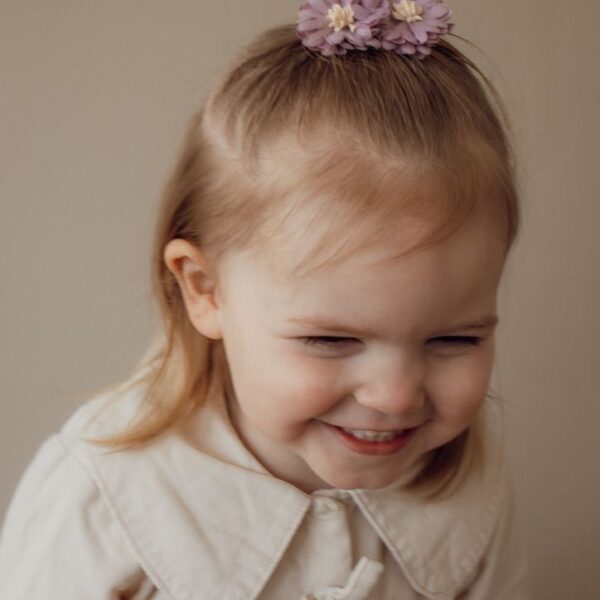Wat Bloem Juna zo bijzonder maakt, is de subtiele elegantie. De bloemen hebben een volle, zachte uitstraling waardoor ze net dat beetje extra geven aan een staartje, half-up hairdo of los vallende plukjes. 🌷✨ De alligatorspeld klikt stevig vast en blijft goed zitten, ook bij gladder haar. Ideaal voor peuters, kleuters en grotere meiden die houden van bloemen in hun hairdo.